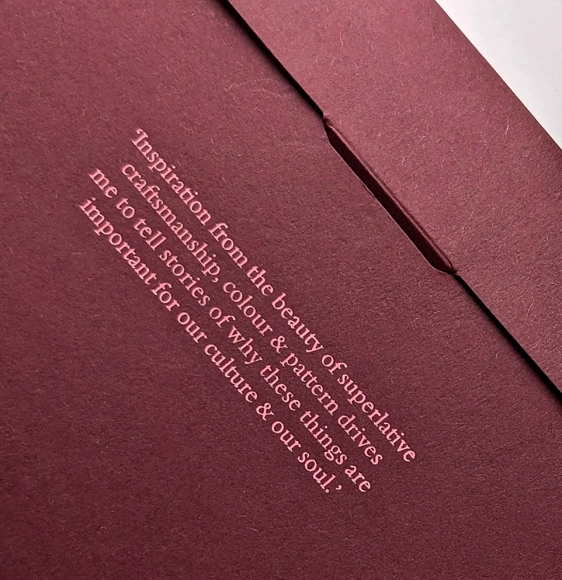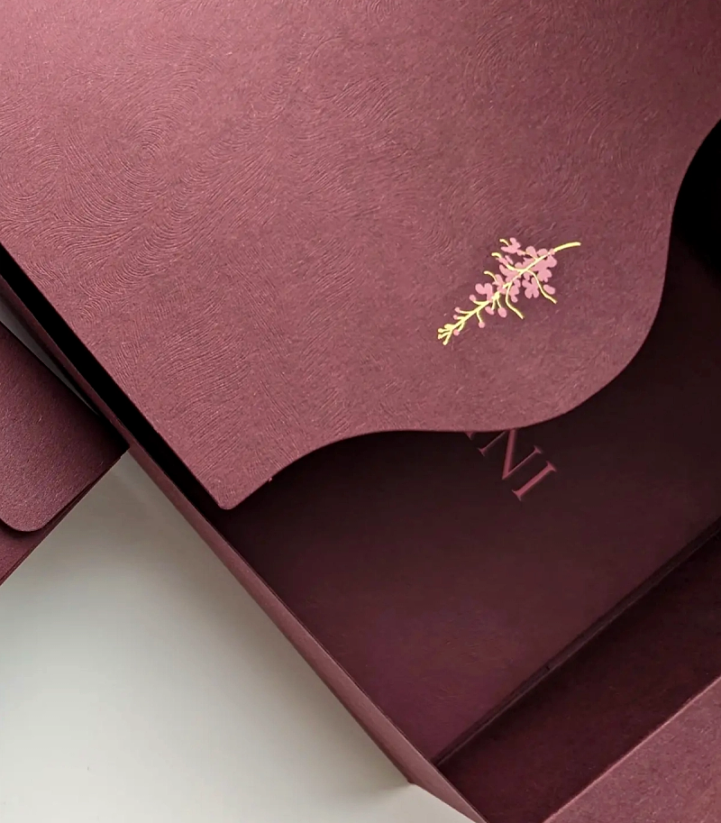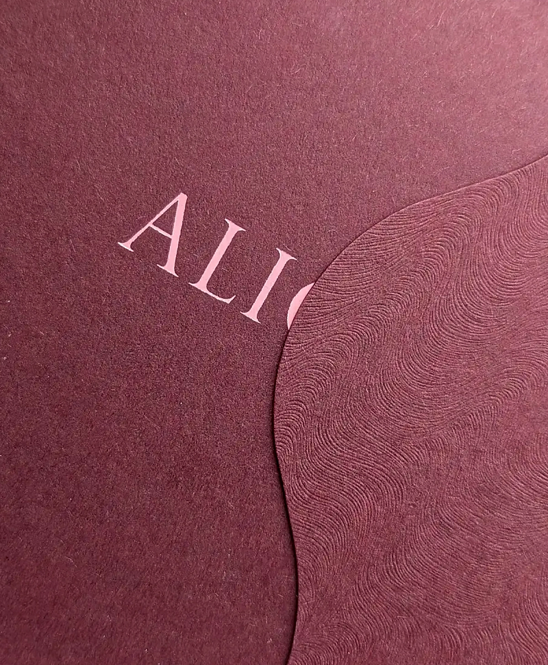 Jewellery box details designed in collaboration with Mariana Sameiro for Alice Cicolini on G . F Smith Colorplan Claret embossed.