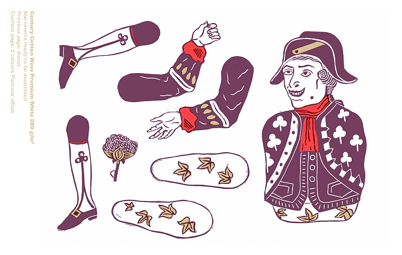 Diecut with marionette ready to be assembled, printed on 3 colours pantone offset.