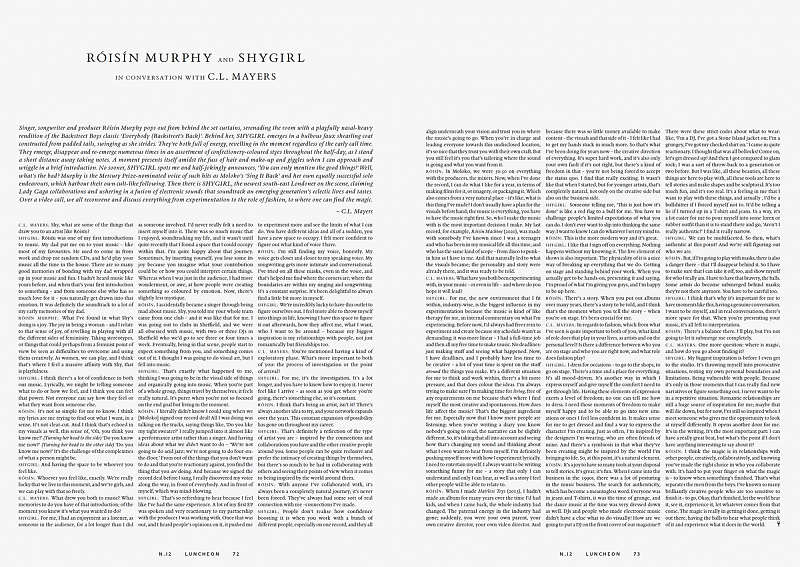 In Luncheon N. 12, Róisín Murphy and Shygirl appear in conversation with C.L. Mayers and are photographed by Paul Kooiker in Bottega Veneta. Paolo Roversi shares photographs of his studio family taken over the years. The issue also features Dancehall Diaries by Akeem Smith and an collection of designer Simone Rocha’s inspirations. Zanne Chaudhry visits the Sergei Paradjanov Museum in Armenia, while works by Georgian artist Niko Pirosmani are presented alongside a text by Ketuta Alexi-Meskhishvili.