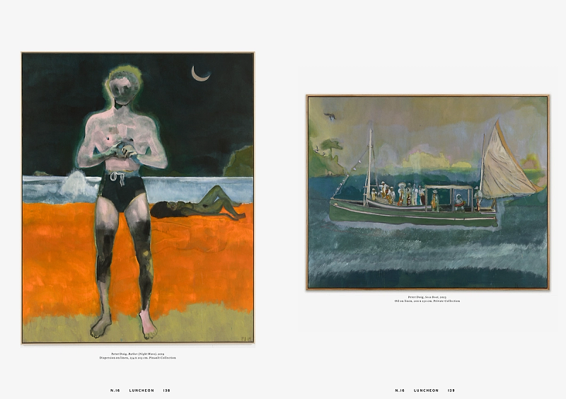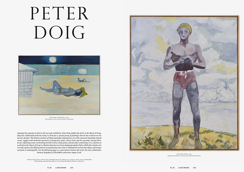 The 16th issue of Luncheon features a piece on Kneecap by Pádraig Ó Meiscill, author Camilla Grudova is interviewed by Oskar Oprey and photographed by Kuba Ryniewicz, while Josefine Skomars journeys to the Greek island of Ikaria with photographer Jesse Laitinen. The issue also includes paintings by Peter Doig accompanied by a conversation with Parinaz Mogadassi and Angus Cook, Feast by Gary Card, Black Minds, a story with photographs by Ekua King and styling by Hanna Kelifa, and Rubbers, a collection by Paul Deller photographed by Jamie Hawkesworth. Other features include Saplings, a series of portraits by Jet Swan; Horn of Plenty, with photographs by Tim Gutt and creative direction by Shona Heath and A Play for Today, a Prada special photographed, directed, and styled by Rachel Fleminger Hudson.