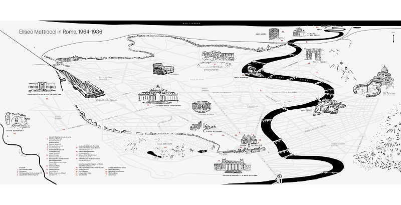 A fold-out map of Rome with illustrations by Giulia Garbin was an important element of the book, accentuating the importance of Rome’s sites and geography at this time in Mattiacci’s practice.