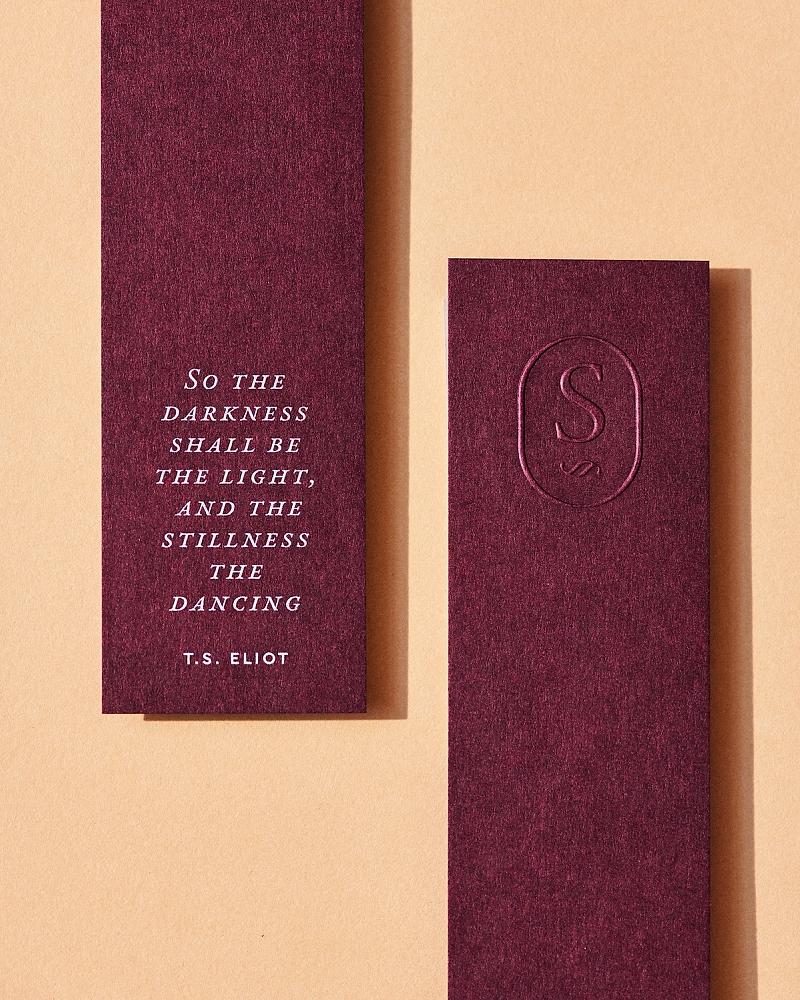 Bookmarks incorporating silver-printed text and a blind-embossed logo on G . F Smith’s Colorplan Claret.